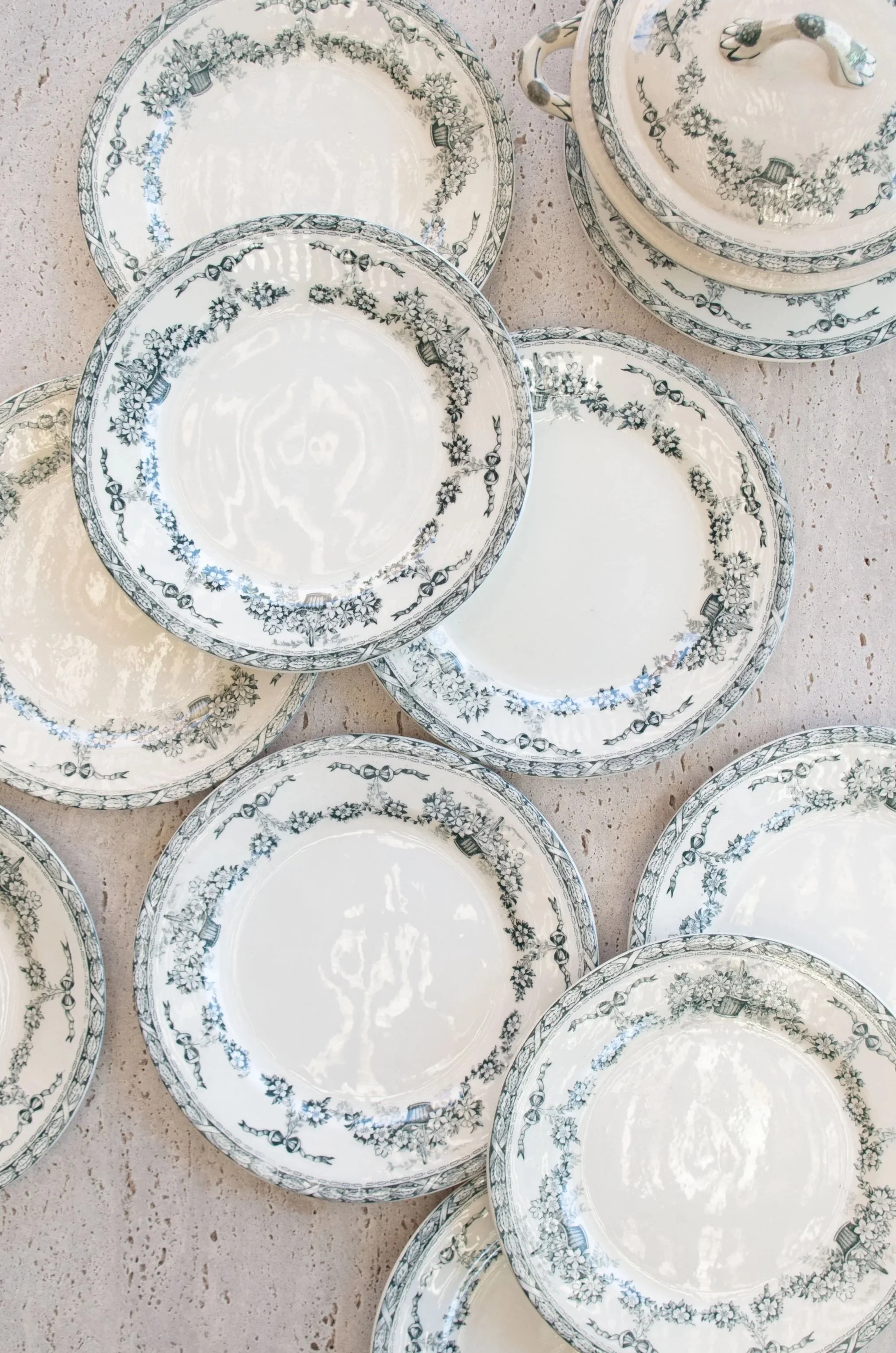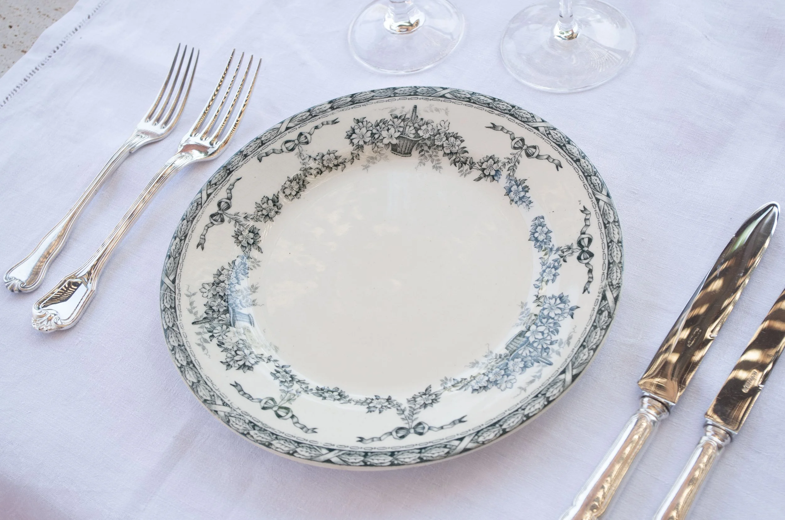 Tout en finesse et en poésie, le modèle Ninon de la manufacture de Salins incarne l’élégance discrète des arts de la table du XIXe siècle. Son décor raffiné, composé de délicates guirlandes fleuries retenues par des rubans noués, évoque le charme des intérieurs bourgeois et des jardins romantiques.