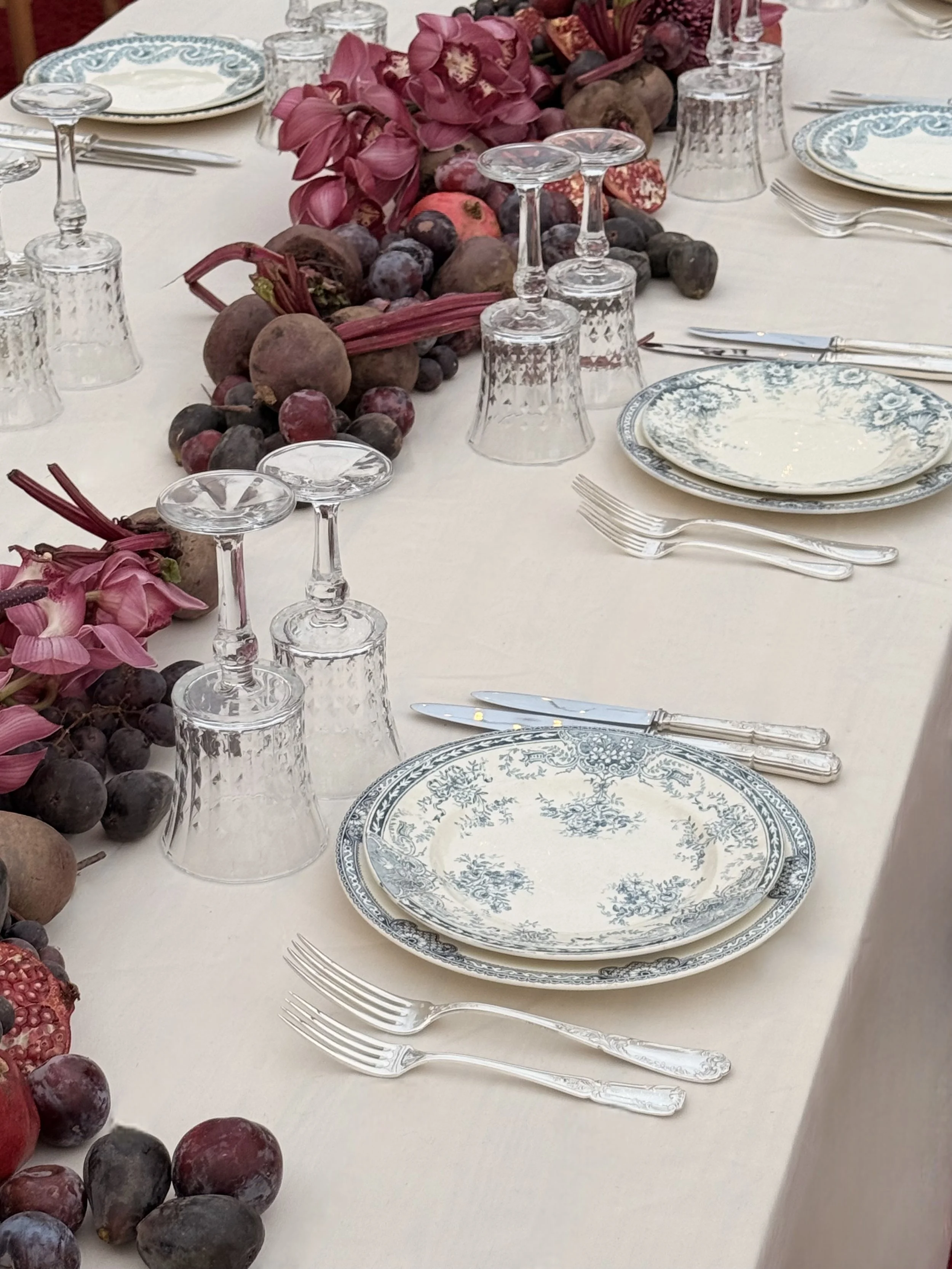 Une table élégante avec des assiettes en porcelaine décorées en bleu et crème, des verres en cristal, des couverts en argent - Location de vaisselle et évènement à Marrakech - Agence Maison Rinceau